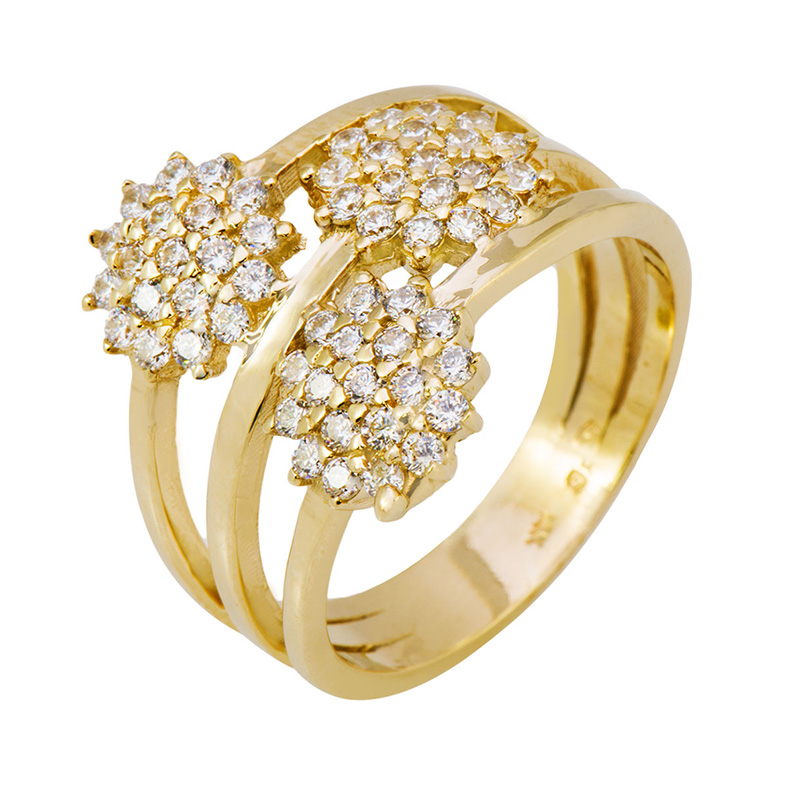 טבעת זהב צהוב 14K משובצת שלשה עיגולים שיבוץ שיניים.