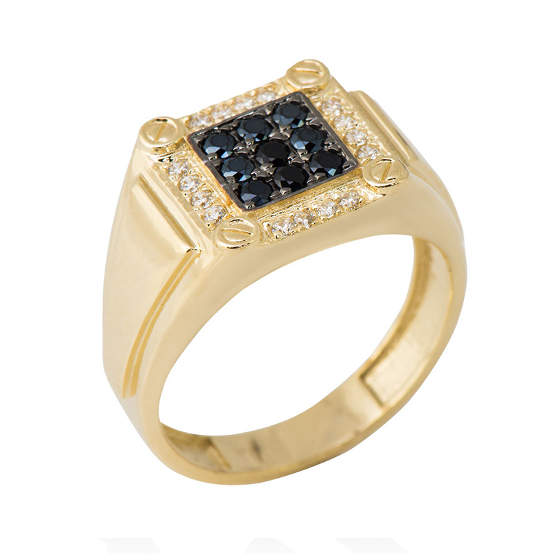 טבעת גבר עשויה זהב צהוב 14 קראט עם סנטר ריבוע משובץ זירקונים שחורים שורת זירקונים לבנים סביב ותבליטים בהיקף.