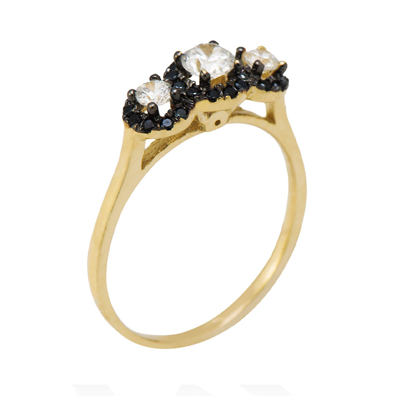 טבעת זהב צהוב 14K משובצת שלשה זירקונים מרכזיים לבנים וזירקונים שחורים סביב.