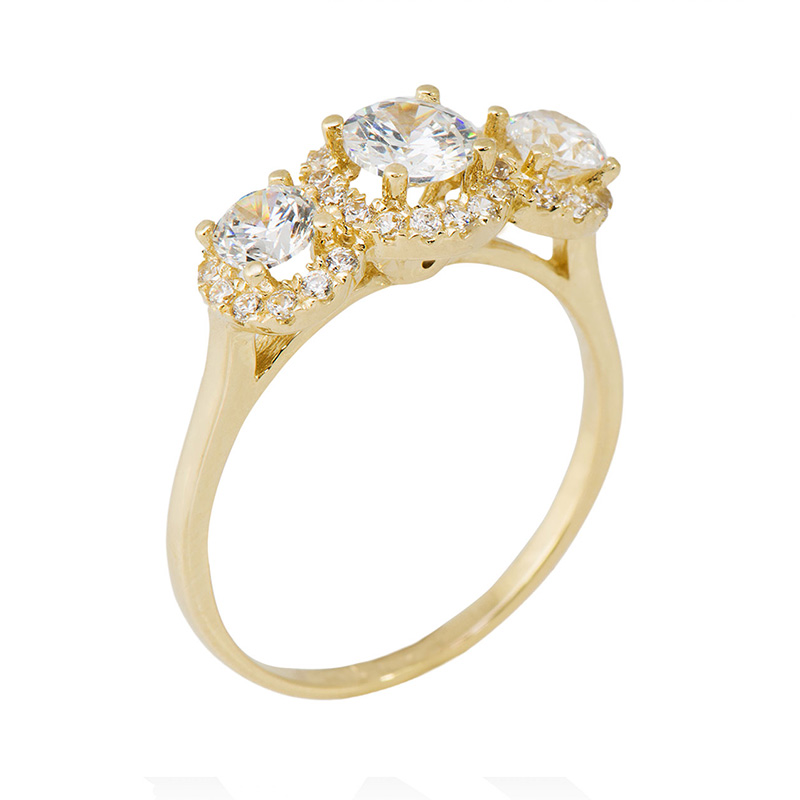 טבעת זהב צהוב 14K משובצת שלשה זירקונים מרכזיים לבנים וזירקונים לבנים סביב.
