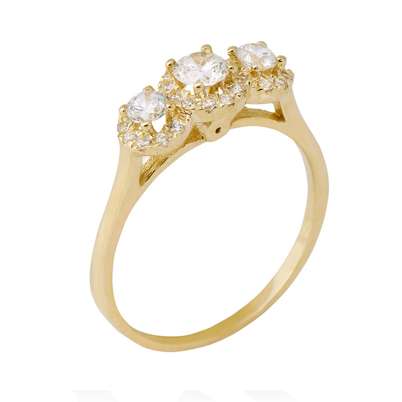 טבעת זהב צהוב 14K משובצת שלשה זירקונים מרכזיים לבנים וזירקונים לבנים סביב.