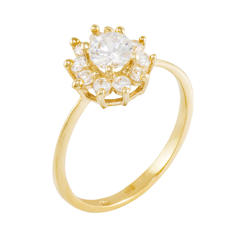 טבעת זהב צהוב 14 קראט משובצת בזירקון לבן מרכזי וסביבו זקרונים לבנים קטנים בשיבוץ שיניים את האבן המרכזית ניתן לקבל במגוון צבעים לבחירה.