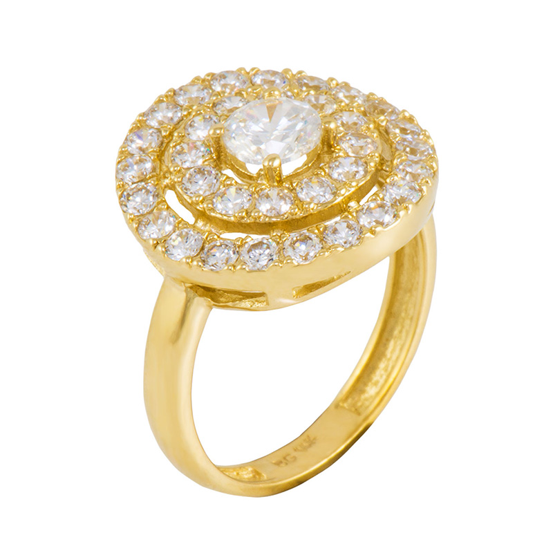 טבעת רדיוסים עשויה זהב צהוב 14K משובצת זירקונים לבנים וזירקון מרכזי.
