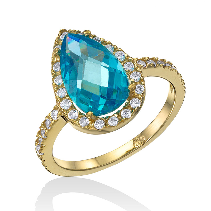 טבעת זהב 14K בשיבוץ אבן מרכזית בצורת מרקיזה מסוג בלו טופז בשיבוץ אבני זירקון לבנות סביב.
