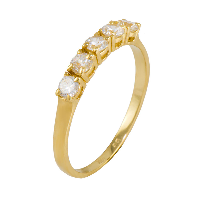 טבעת עשויה זהב צהוב 14K משובצת חמישה זירקונים לבנים בשיבוץ שיניים.