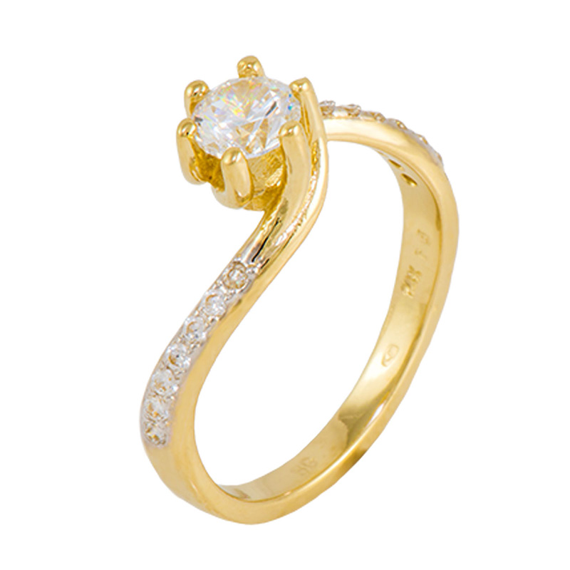 טבעת סוליטר זהב צהוב 14K בשיבוץ אבן זירקון לבנה מרכזית ושורת אבני זירקון קטנות סביב.