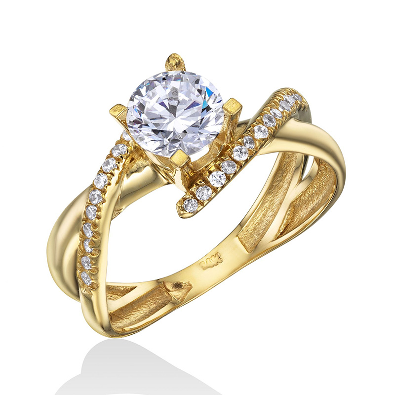 טבעת זהב 14K סוליטר משובצת אבן זירקון מרכזית בשיבוץ שיניים ובה שני פסים מלופפים: האחד בשיבוץ זירקונים לבנים והשני חלק.