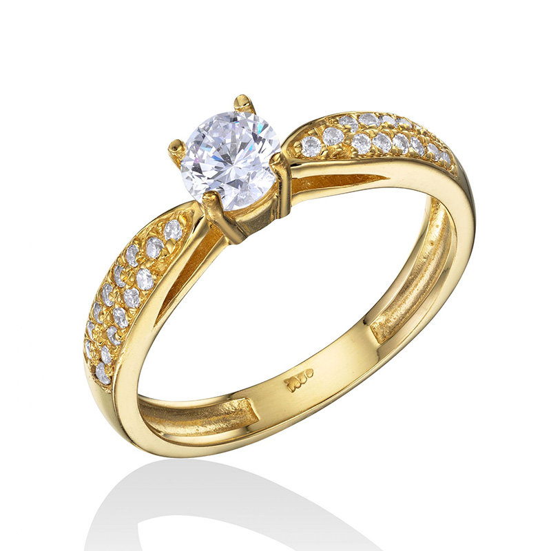 טבעת זהב 14K סוליטר משובצת אבן זירקון מרכזית בשיבוץ שיניים ושתי שורות זירקונים לבנים.