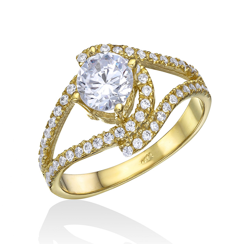 טבעת זהב 14Kמשובצת אבן זירקון לבנה מרכזית בין 2 שורות עוטפות המשובצות אבני זירקון לבנות.