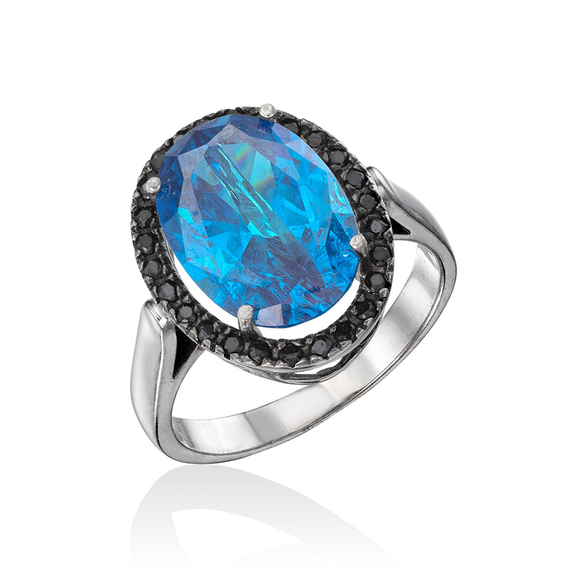 טבעת זהב לבן 14K בשיבוץ אבן אובלית מרכזית כחולה משובצת אבני זירקון שחורות סביב.