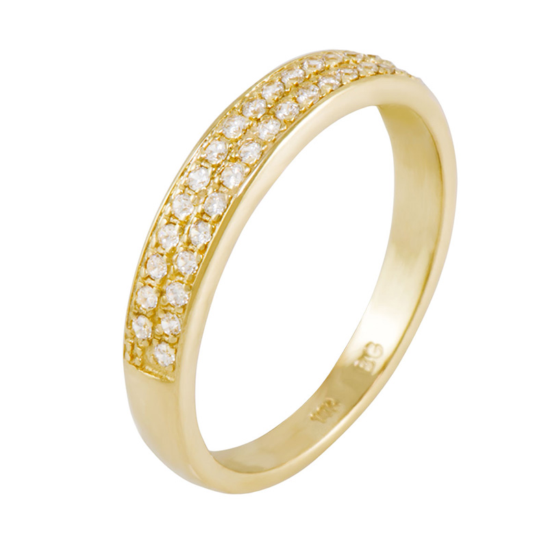טבעת זהב צהוב 14K משובצת שתי שורות אבני זרקון לבנות.