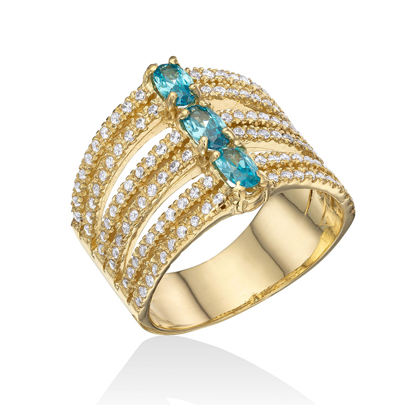 טבעת זהב 14K במרכזה משובצות שלוש אבני בלו טופז אובליות (או אבן אחרת לבחירת לקוח) כשלכל אחת מהן חוברות שתי שורות בשיבוץ אבני זירקון לבנות.