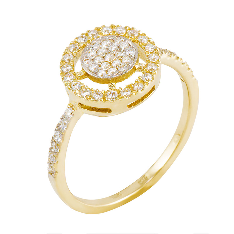 טבעת עשויה זהב צהוב 14K משובצת זירקונים לבנים עם עיגול מרכזי משובץ וטבעת עם שורת זירקונים סביב.
