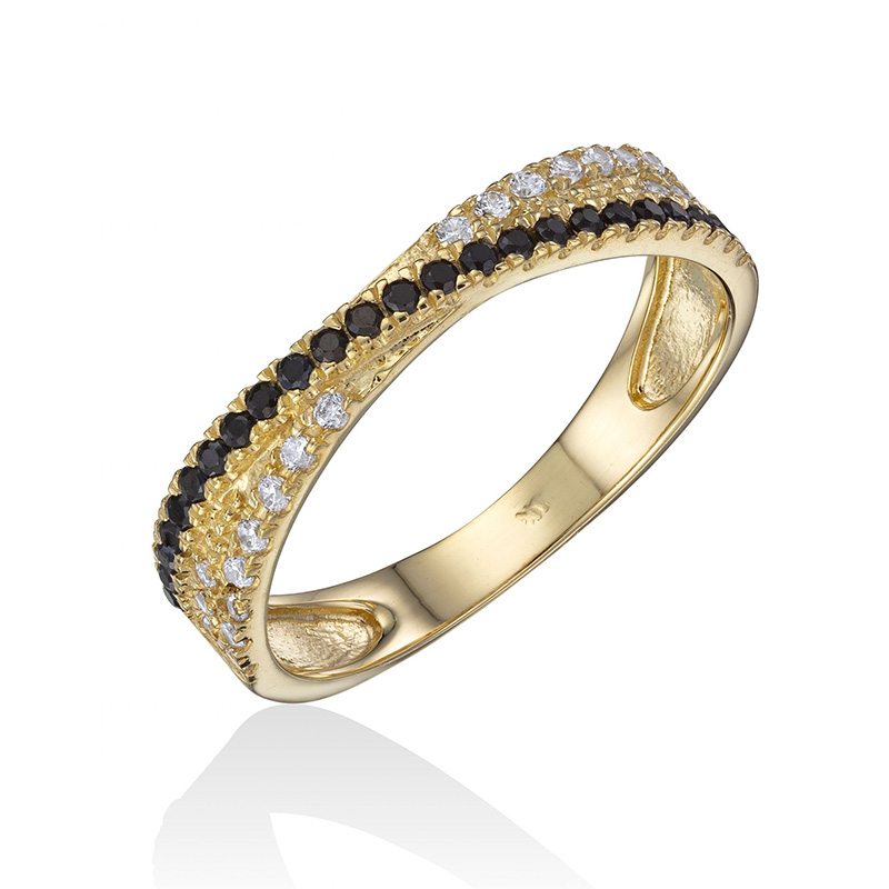 טבעת זהב 14K משובצת שורת אבני זירקון לבנות ושורת אבני זירקון שחורות מצטלבות.