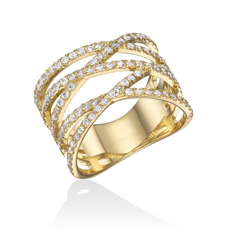 טבעת זהב 14K משובצת חמש שורות אבני זירקון לבנות מצטלבות.