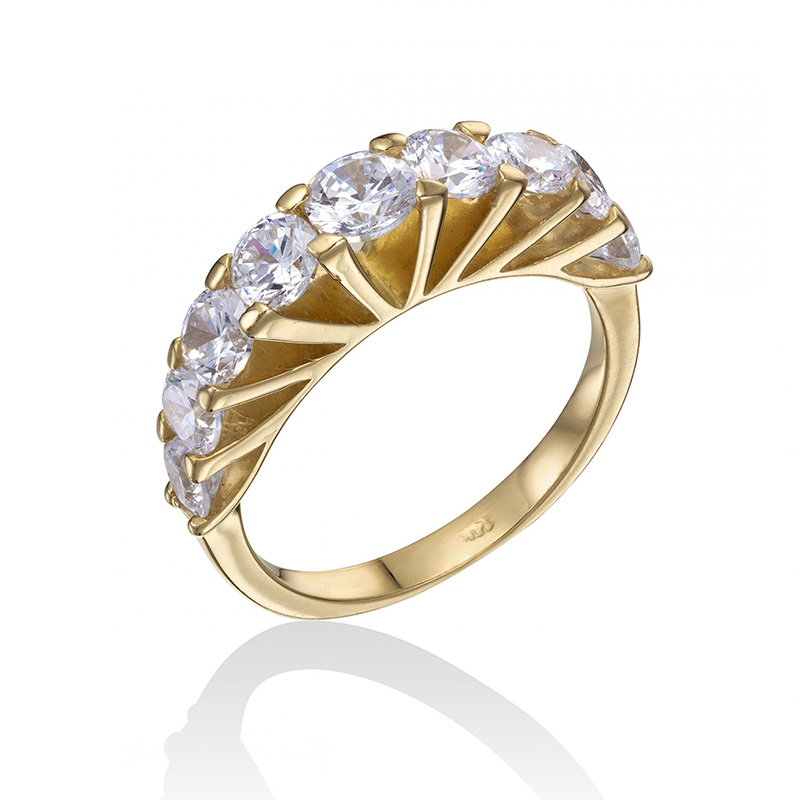 טבעת זהב 14K משובצת שורת אבני זירקון לבנות בולטות בצורת מניפה.