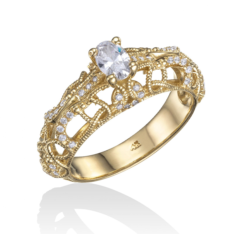 טבעת זהב 14K אבן מרכזית זירקון לבנה בעיצוב תחרה ושיבוץ אבני זירקון לבנות קטנות.