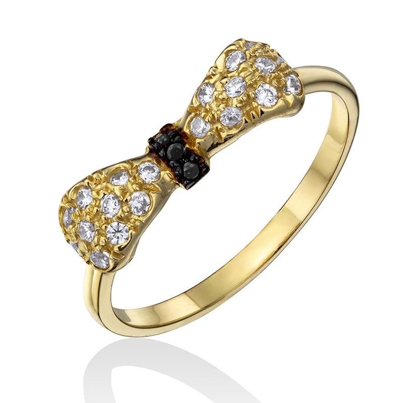 טבעת זהב 14K בצורת פפיון משובצת אבני זירקון לבנות ושחורות.