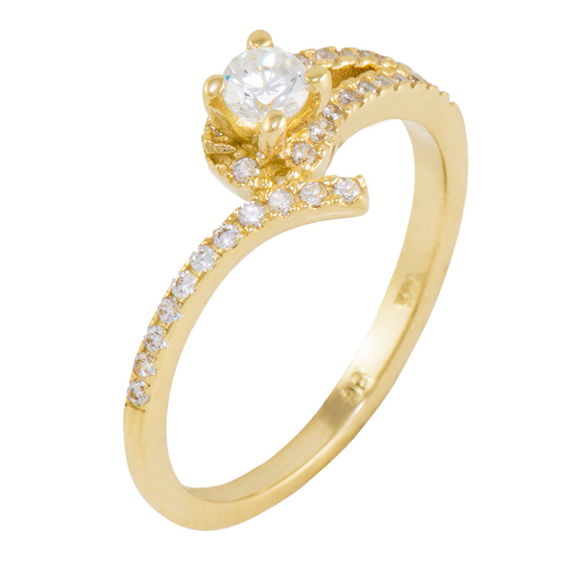 טבעת סוליטר זהב צהוב 14K א-סימטרית בשיבוץ אבן זירקון לבנה מרכזית ושורות אבני זירקון לבנות סביב.