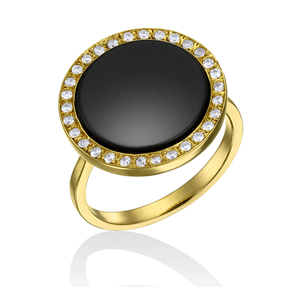טבעת עגולה עשויה זהב K14, משובצת באבן אוניקס שחורה וסביבה אבני זירקון מבריקות ונוצצות למרחקים.
