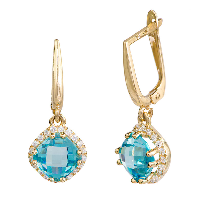 זוג עגילים תלויים זהב צהוב 14 קראט משובצים אבן מרכזית בלו טופז בשיבוץ שיניים ושורת זירקוזים לבנים סביב. ניתן לבחור צבע לאבן המרכזית.