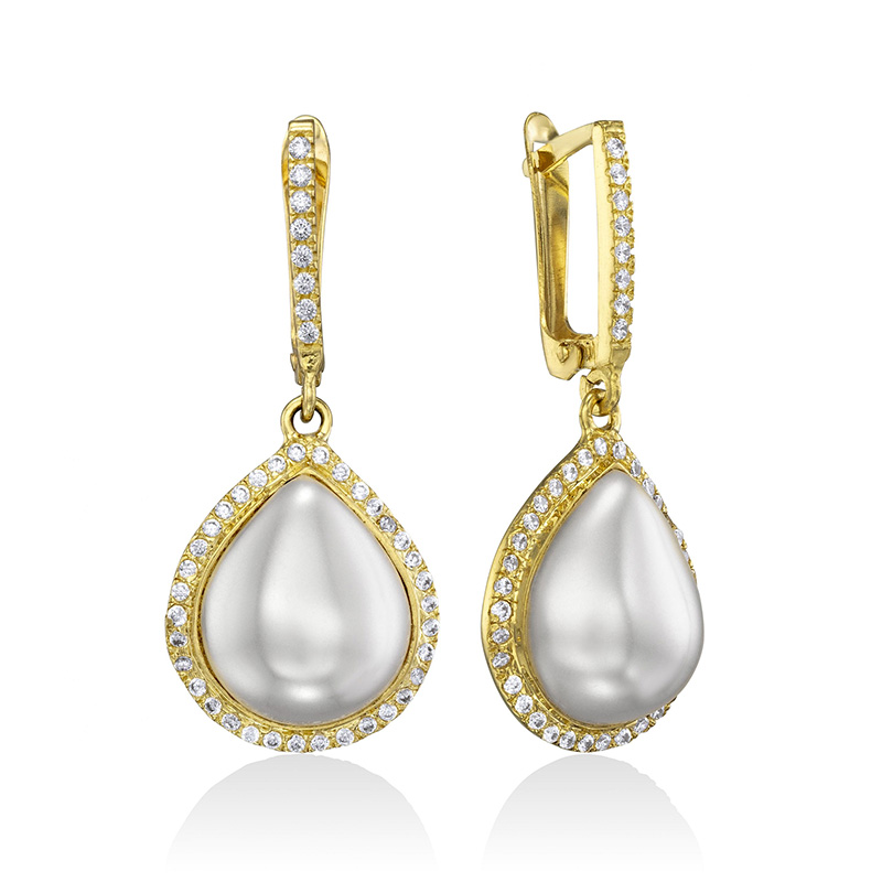 זוג עגילי זהב 14K תלויים משובצים אבן פנינה לבנה אמיתית ואבני זירקון לבנות סביב התלי משובץ גם הוא אבני זירקון לבנות.