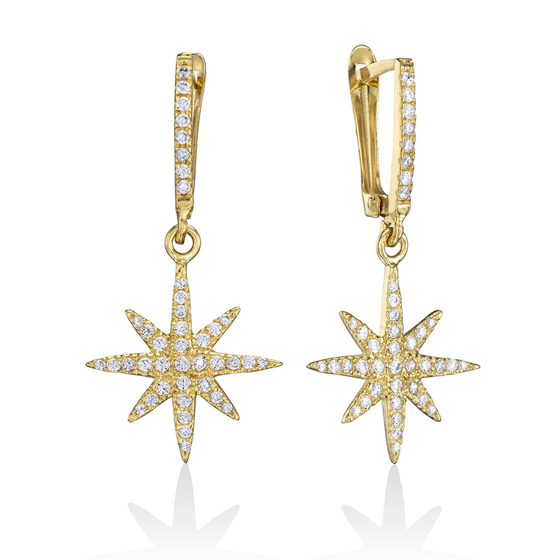 זוג עגילי זהב 14K תלויים בצורת כוכב משובצים אבני זירקון לבנות התלי משובץ גם הוא אבני זירקון לבנות.