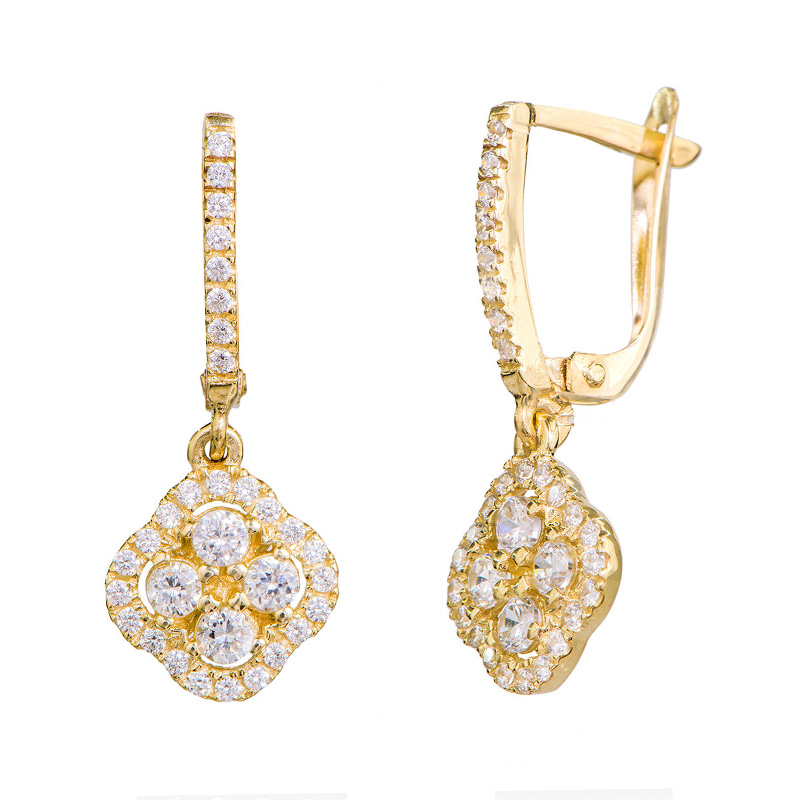 זוג עגילים תלויים זהב צהוב 14K משובצים זירקונים לבנים בצורת תלתן.