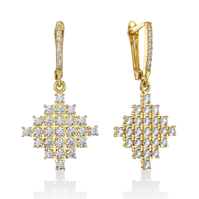זוג עגילי זהב 14K תלויים בצורת מעויינים משובצים אבני זירקון לבנות או שחורות לבחירת לקוח.