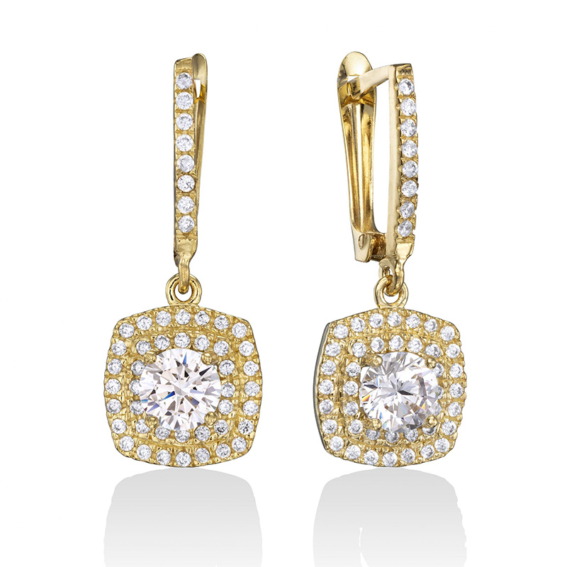 זוג עגילי זהב 14K תלויים בשיבוץ אבן זירקון לבנה מרכזית ושתי שורות זירקונים לבנים משובצים בקונטור ריבוע סביב התלי משובץ גם הוא זירקונים לבנים.
