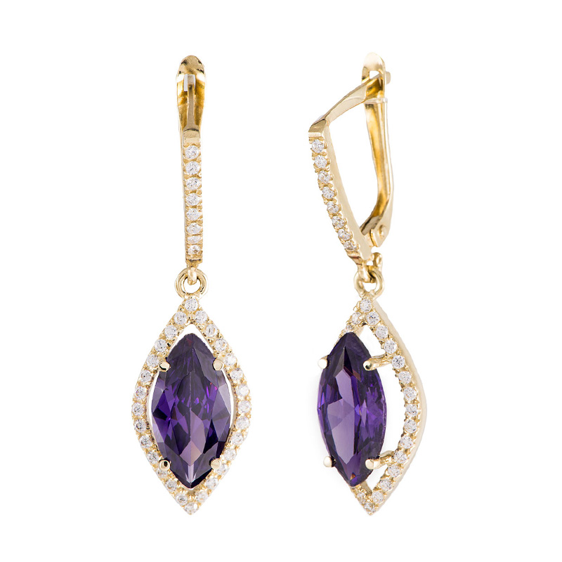 זוג עגילים תלויים עשויים זהב צהוב 14 קראט בצורת מרקיזה אבן מרכזית אמטיסט סגולה בשיבוץ שיניים שורת זירקונים סביב. האבן המרכזית לבחירה במגוון צבעים. התלי משובץ זירקונים לבנים.