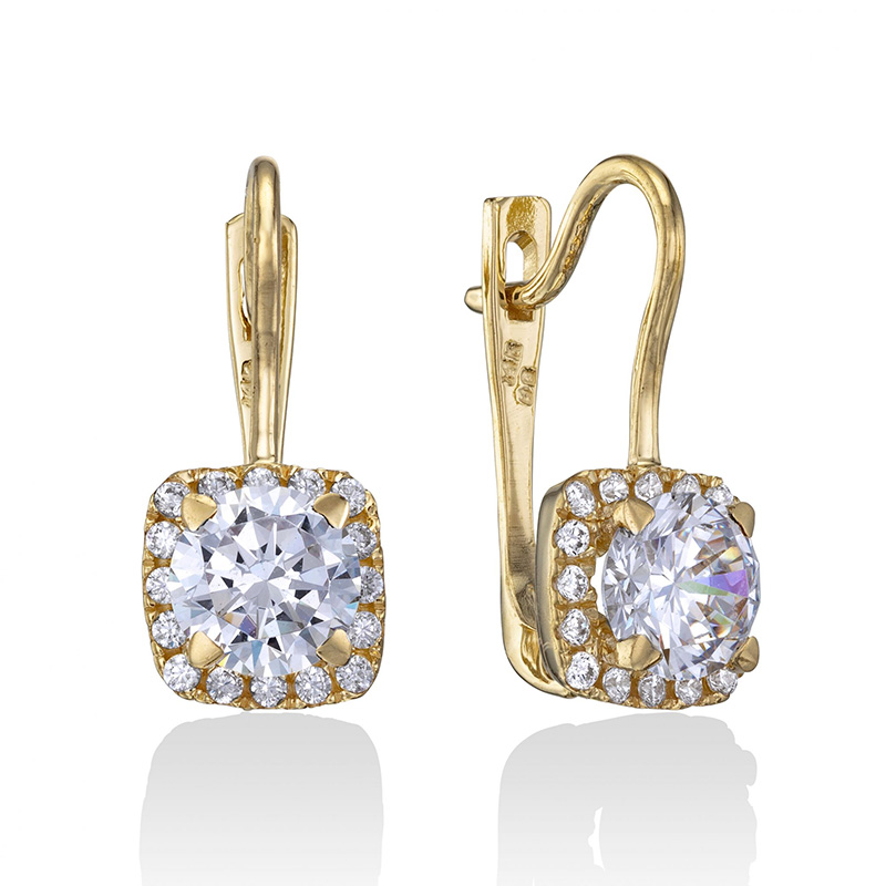 זוג עגילי זהב 14K בננה בשיבוץ אבן זירקון לבנה מרכזית ושורת זירקונים לבנים משובצים בקונטור ריבוע סביב.