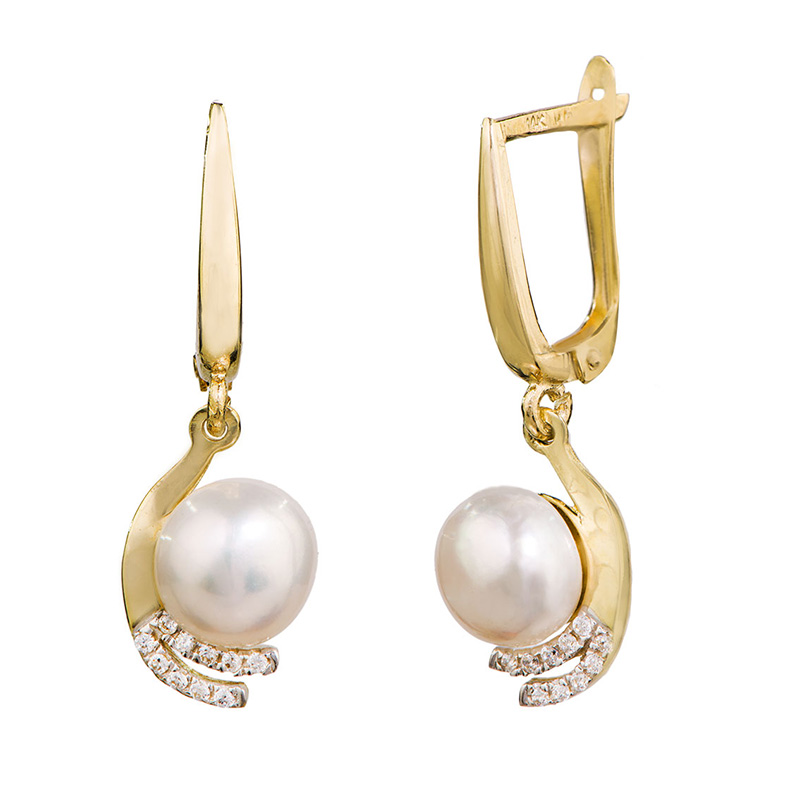 זוג עגילי זהב צהוב 14K משובצים זירקונים לבנים עם פנינה אמיתית.