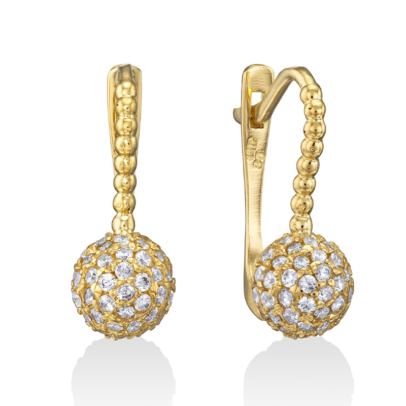 זוג עגילי זהב 14K בננה המשובצים אבני זירקון בנות על בסיס חצי כדור התלי משובץ גם הוא אבני זירקון לבנות.