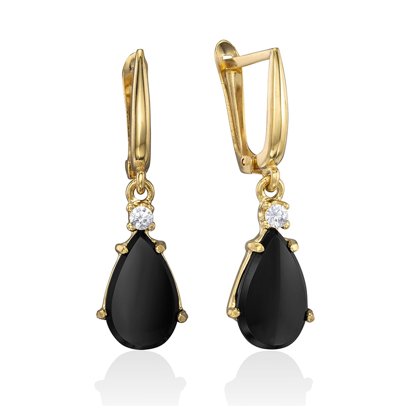 זוג עגילי זהב 14K תלויים משובצים אבן שחורה אוניקס בצורת מרקיזה בשיבוץ שיניים אבן זירקון לבנה עגולה מעל.