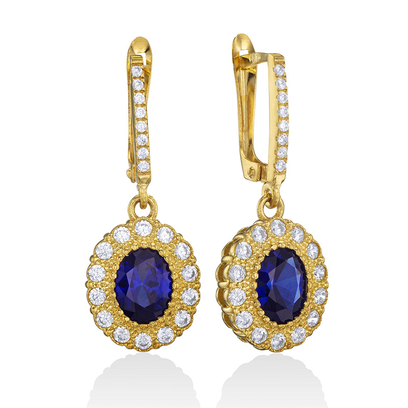 זוג עגילי זהב 14K תלויים משובצים אבן אובלית מרכזית בצבע לבחירת לקוח בשיבוץ אבני זירקון לבנות סביב ולאורך התלי.