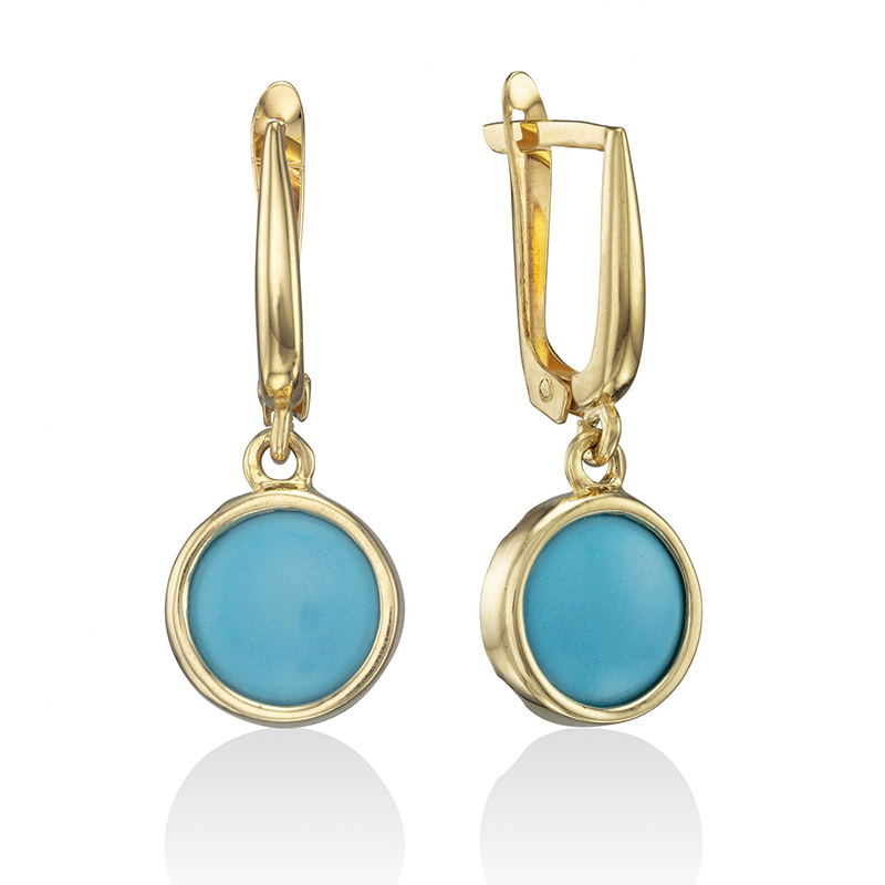 זוג עגילי זהב 14K תלויים משובצים אבן טורקיז כחולה עגולה.