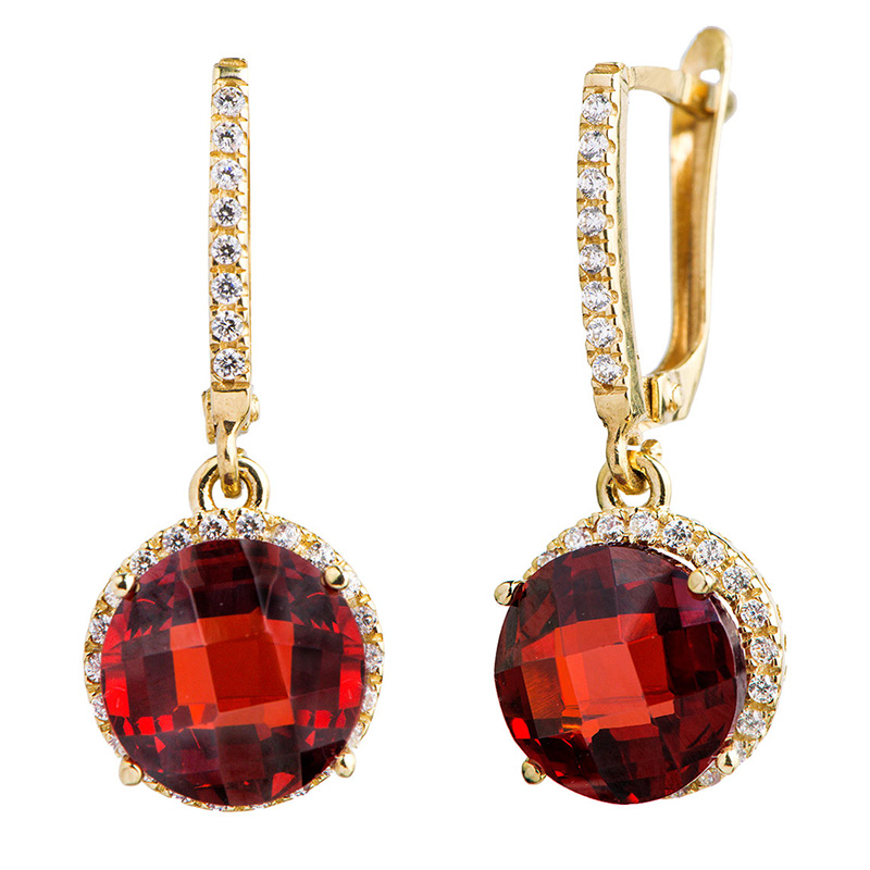 עגילים תלויים זהב צהוב 14K בשיבוץ זירקונים לבנים במרכז אבן זירקון בצבע גרנט (אדום) התלי משובץ זירקונים לבנים האבן המרכזית ניתנת לבחירה במגוון צבעים.