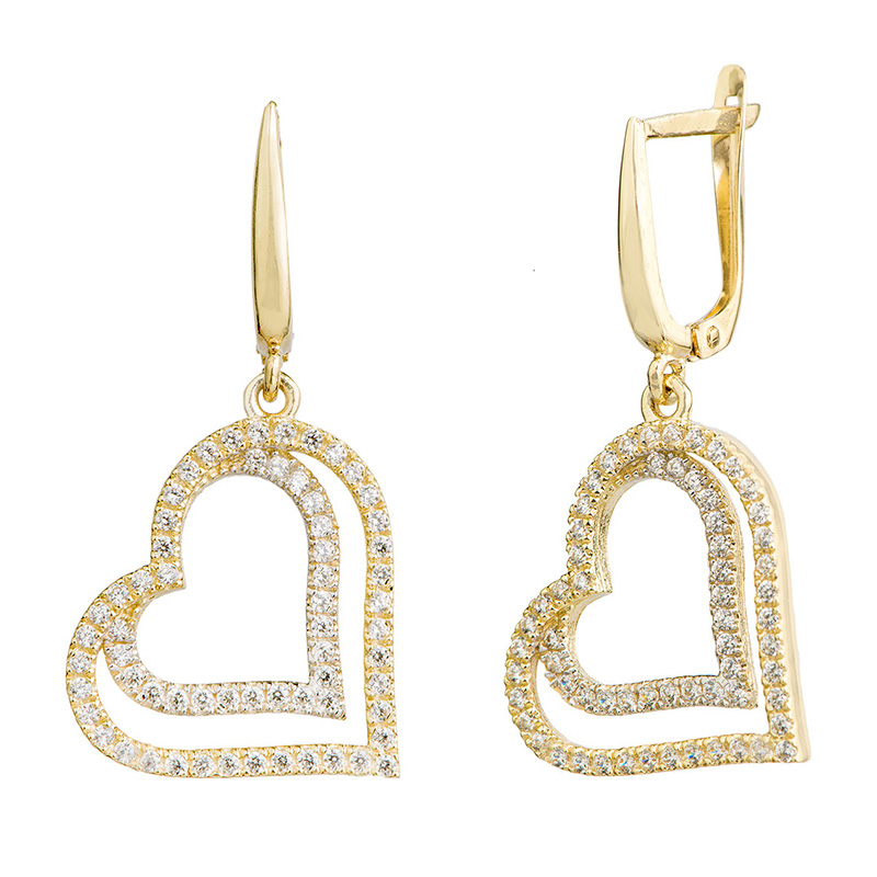 זוג עגילי זהב תלויים לני העשויים זהב צהוב K14, בצורה של לב קטן בתוך לב גדול.