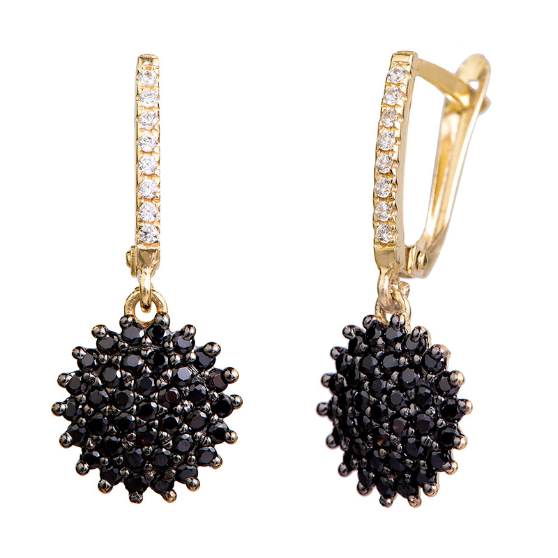 עגילים תלויים עשויים זהב צהוב K14, משובצים באבני זירקון שחורים, עם תלי משובץ זירקונים לבנים בוהקים.
