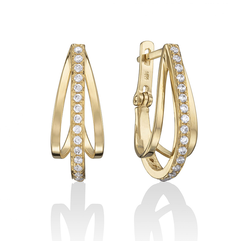 זוג עגילי זהב 14K בננה משובצים פס מרכזי באבני זירקון לבנות/ שחורות לבחירת לקוח ופס זהב מכל צד.