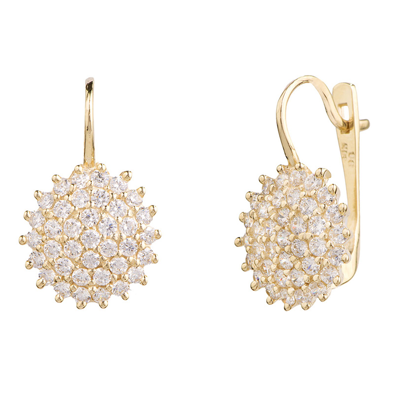 זוג עגילי בננה עשויים זהב צהוב 14K משובצים זירקונים לבנים בשיבוץ מעגלי.