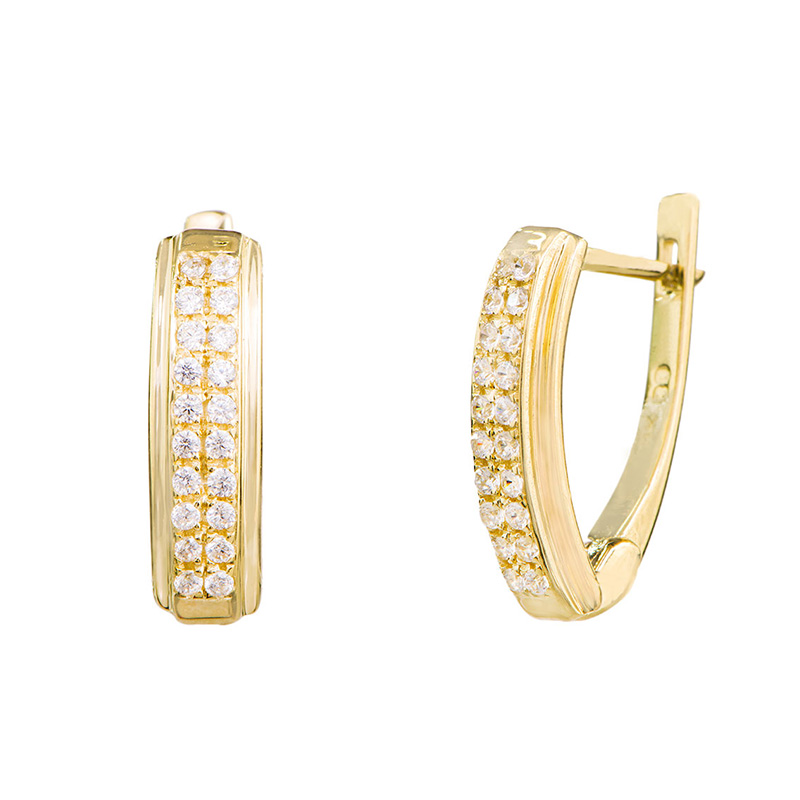 זוג עגילי בננה בעיצוב קלאסי ועדין עשויים זהב צהוב 14K משובצים שתי שורות זירקונים לבנים.