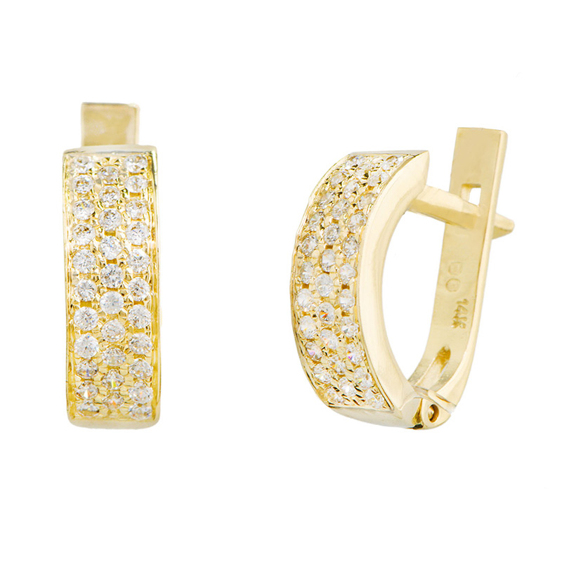 זוג עגילי בננה עשויים זהב צהוב 14K משובצים שלוש שורות אנכיות של זירקונים לבנים.