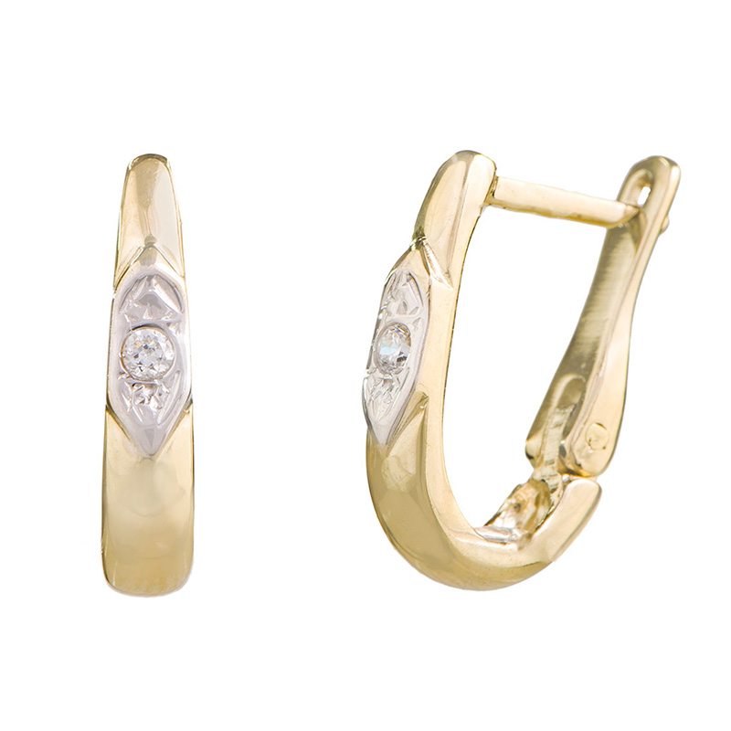 זוג עגילי בננות עשויים זהב צהוב 14K בשילוב זהב לבן 14K בשיבוץ זירקון מרכזי.