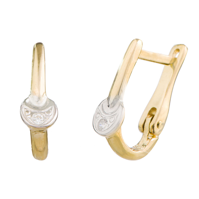 עגילי בננות זהב צהוב 14K משולבות אלמנט מרכזי דמוי "צלחת" בזהב לבן 14K.