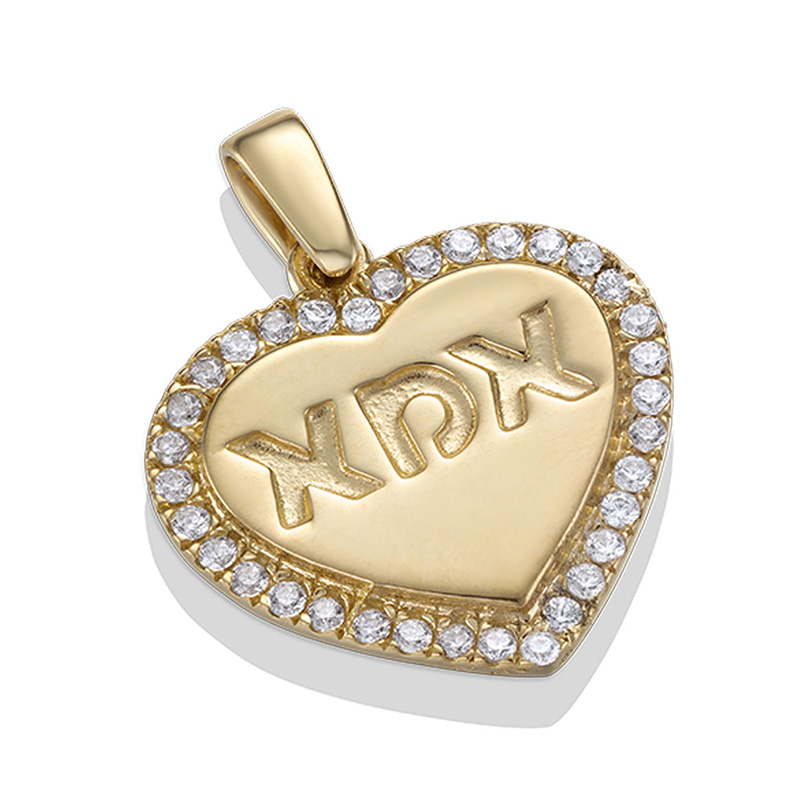 תליון זהב 14K בצורת לב עם כיתוב "אמא" מוטבע באותיות דפוס משובץ שורת אבני זירקון לבנות סביב.
