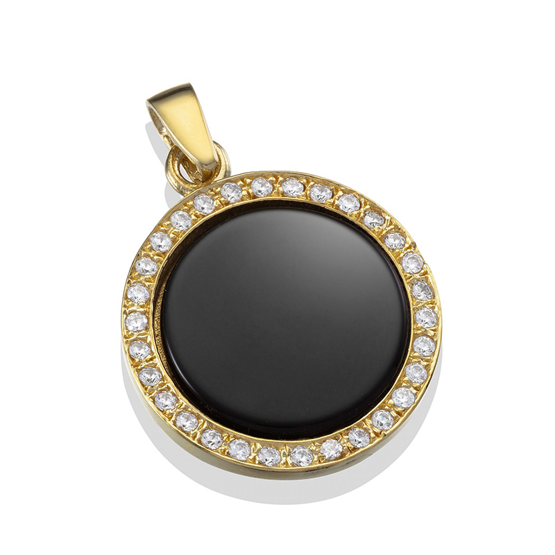 תליון זהב 14K בשיבוץ אבן אוניקס שחורה מרכזית עגולה בשיבוץ אבני זירקון לבנות סביב.