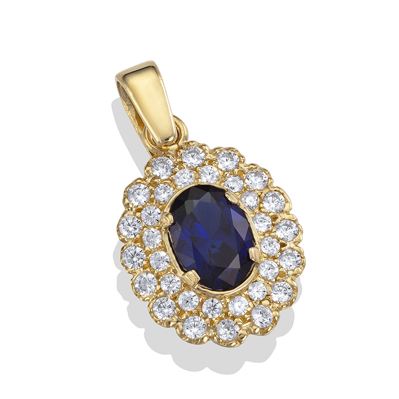 תליון זהב 14K משובץ אבן אובלית בצבע לבחירת לקוח בשיבוץ אבני זירקון לבנות סביב בשתי שורות.