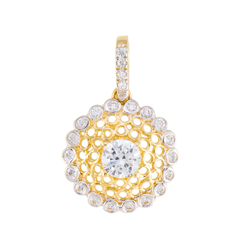 תליון זהב 14K משובץ זירקון לבן מרכזי וטבעת זירקונים לבנים היקפית ביניהם עיגולי זהב חלולים המייצרים טקסטורת רקמה עדינה. התליון משולב זהב צהוב ולבן.
